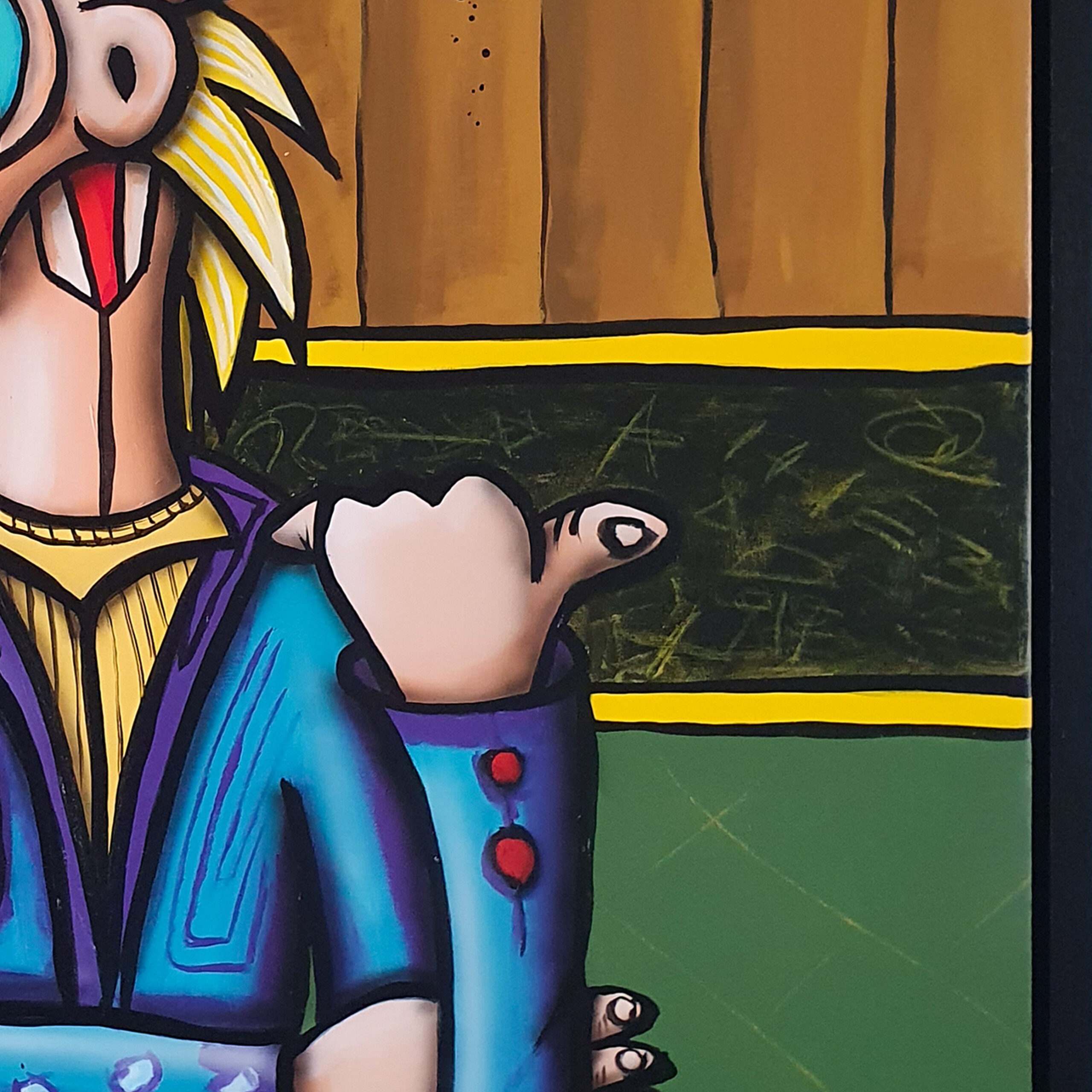 Acrylic, spray paint, markers, airbrush on canvas and with a modern black frame. (86 x 86 x 4 cm)