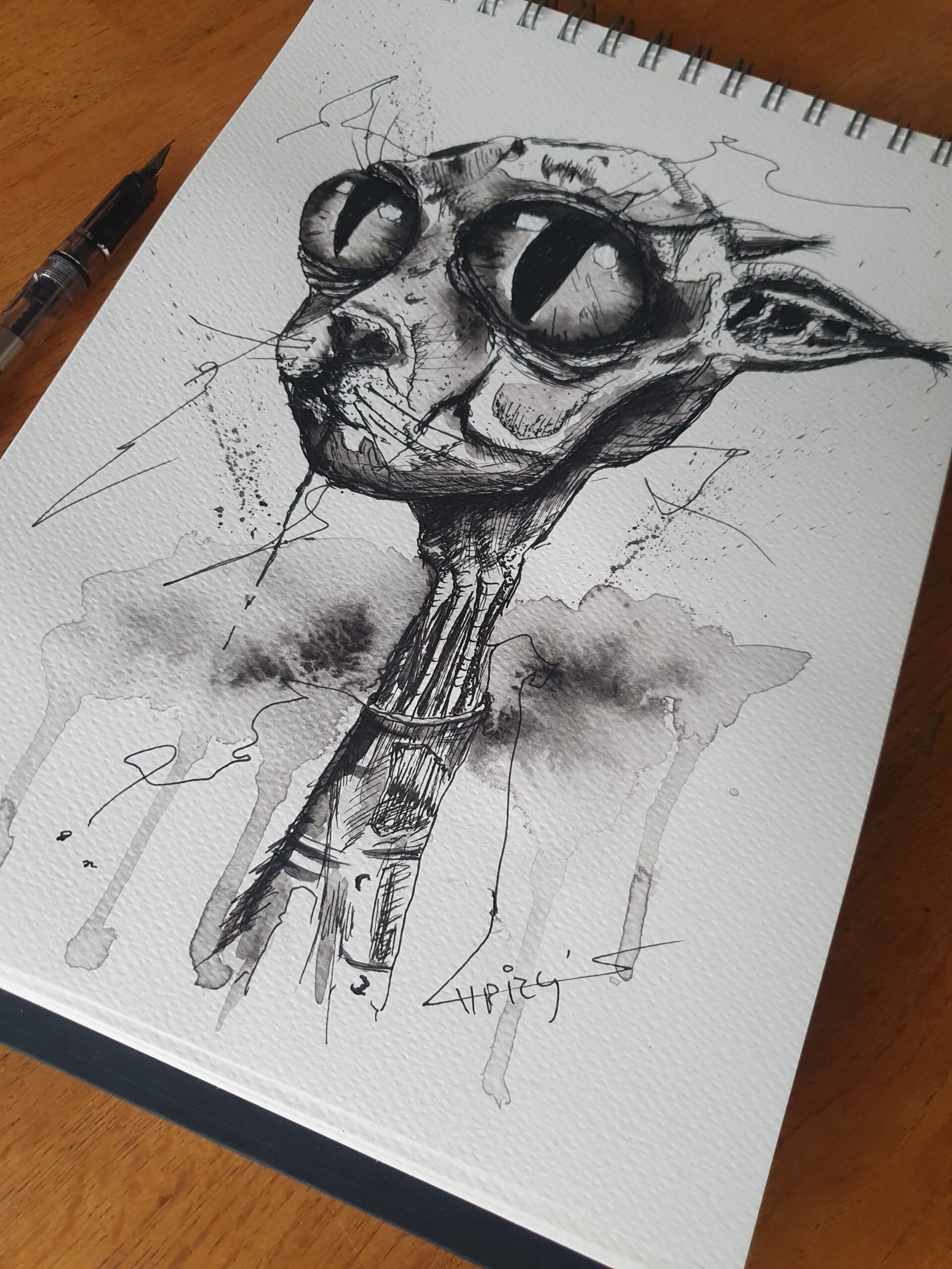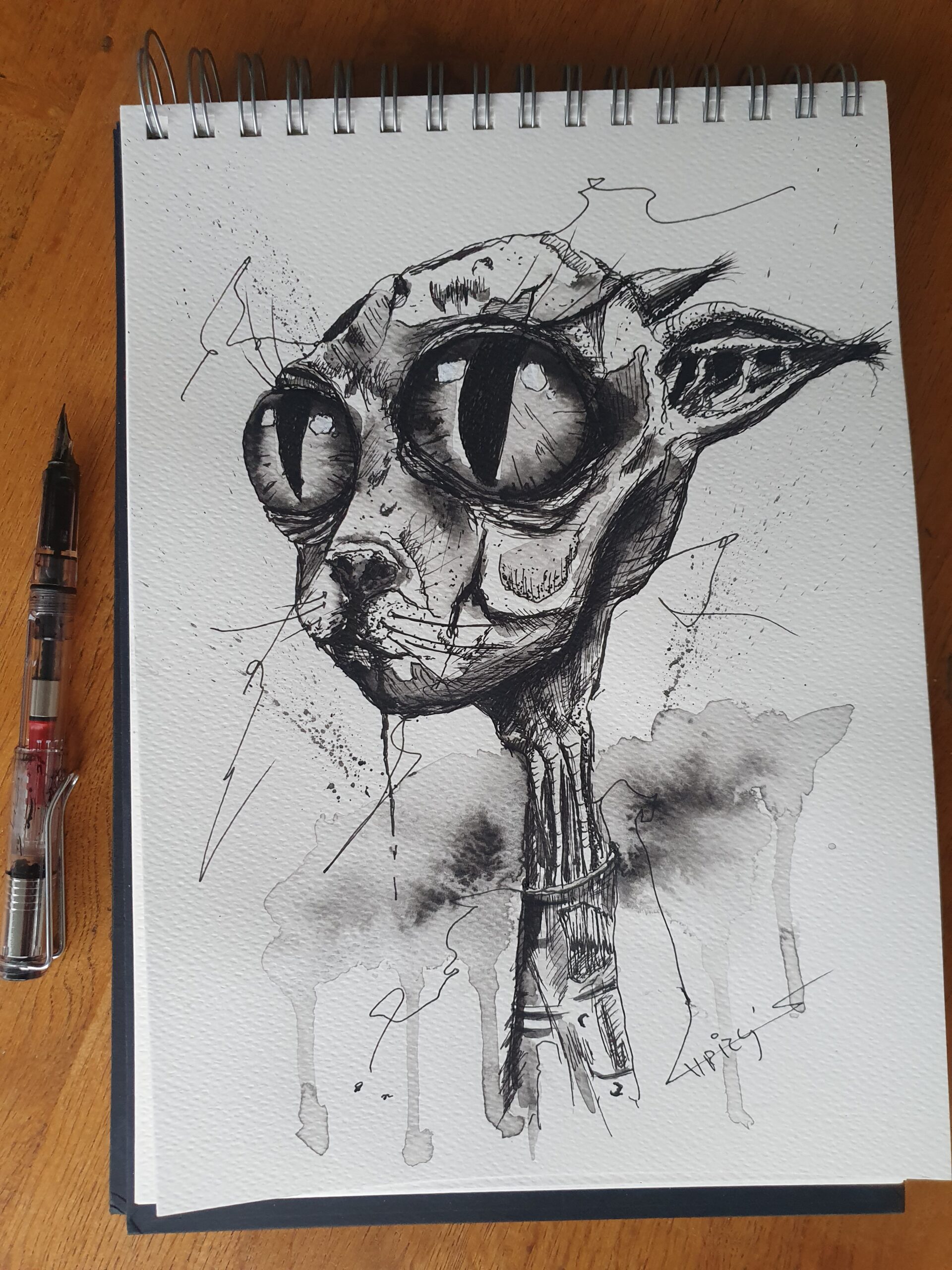 This captivating pen drawing features a mysterious cat with large, expressive eyes that seem to hold untold secrets. The intricate lines and deep shadows create a rich texture, giving the artwork a sense of depth and realism. Blurred ink splatters add an ethereal quality, enhancing the enigmatic aura of the piece. The seamless blend of realistic detail and abstract elements draws viewers into a world of intrigue, symbolizing the fragile balance of nature.