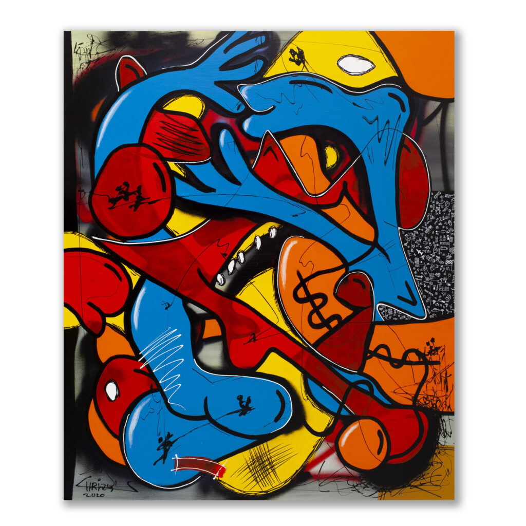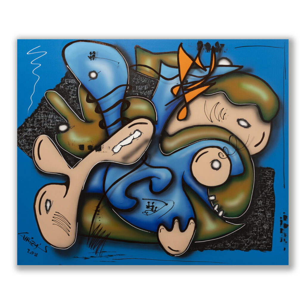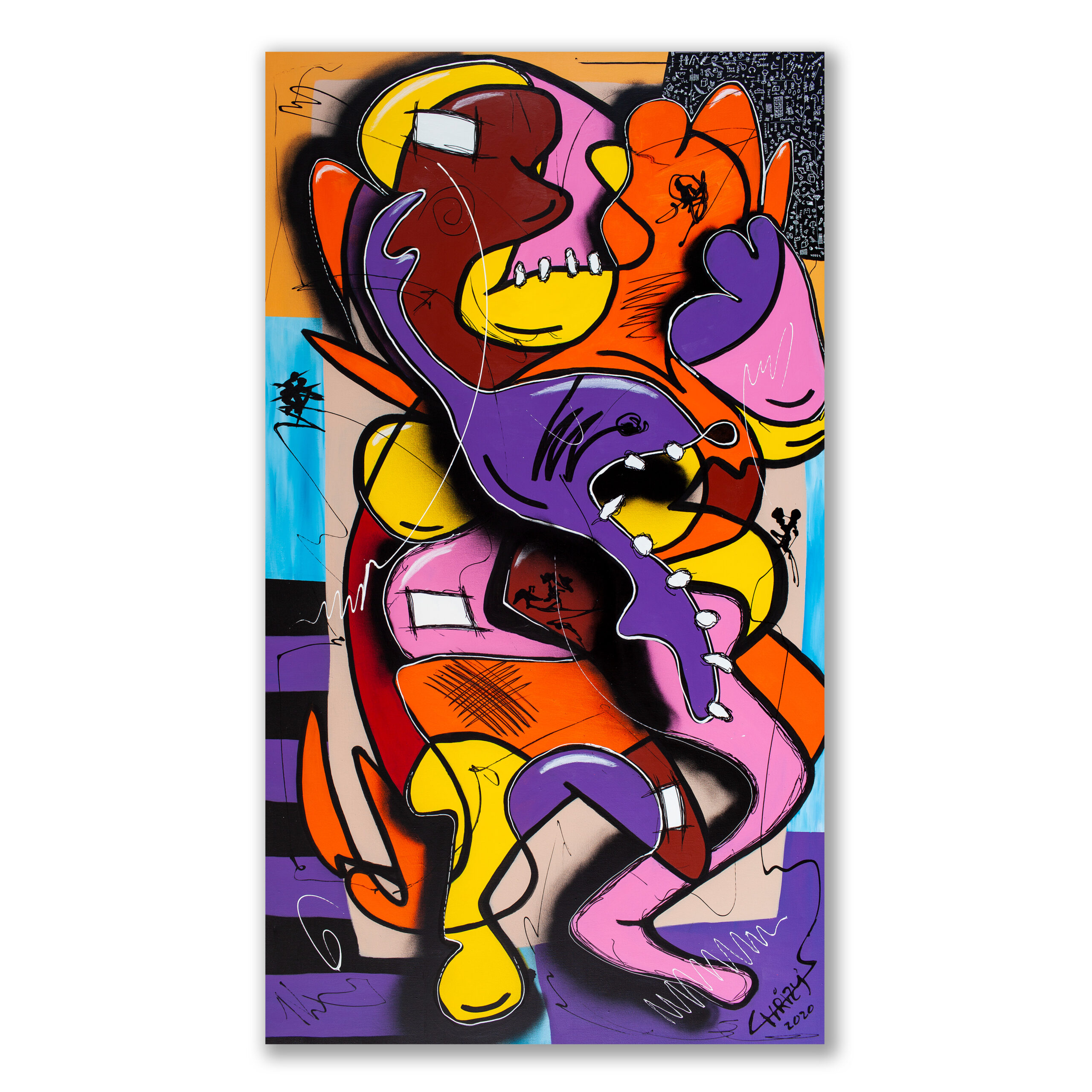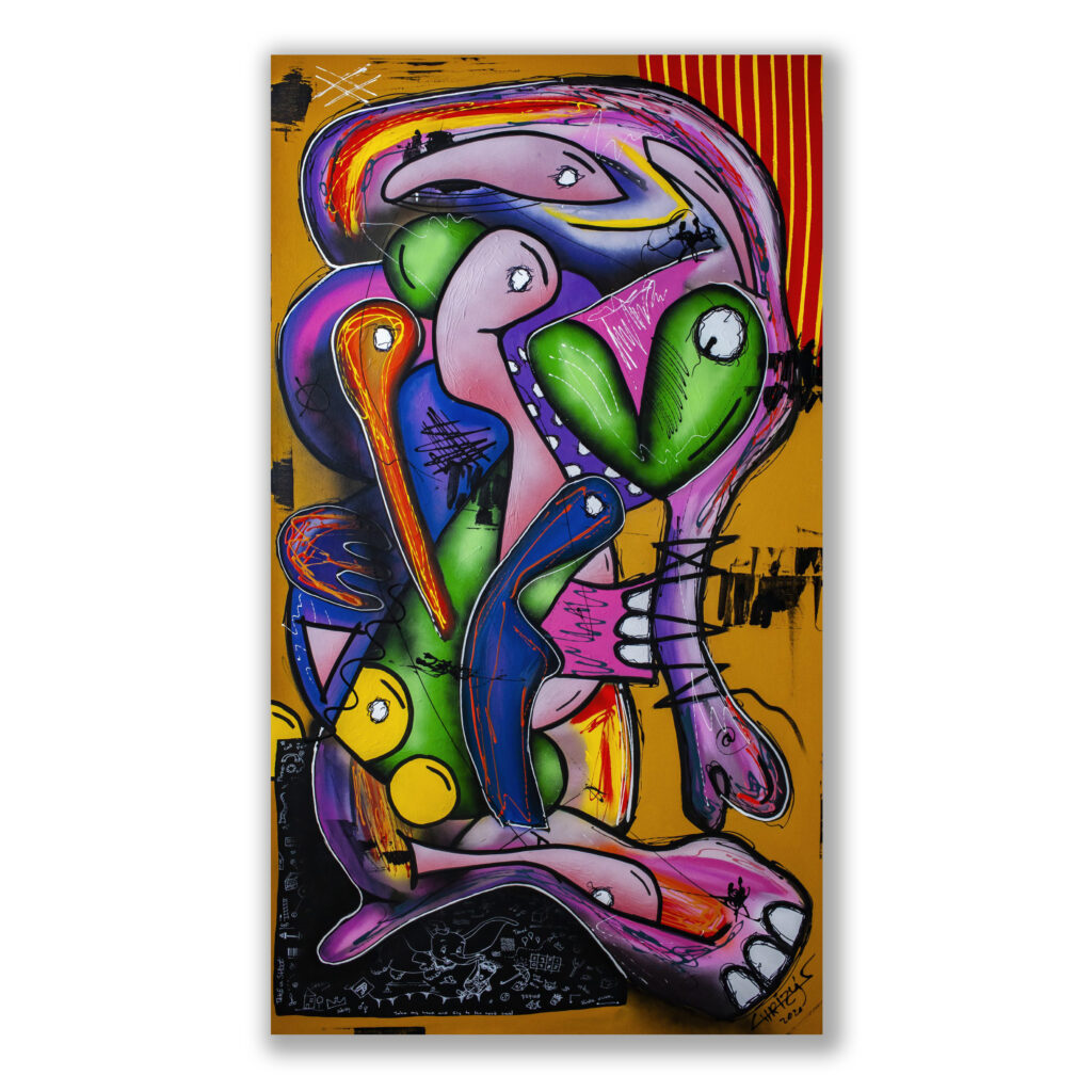 Modern abstract paintings with a touch of urban and sometimes also pop art. Bright colors and strong contrasts predominate. Christian’s paintings symbolize love and/or everyday events. Each painting has its own story. The abstraction will allow everyone to see their own adventure in the work. If you look at the abstract figures longer and read the title of the painting, you will recognize more and more familiar shapes. The painting then takes shape and comes to life. The abstract shapes that Christian uses are often people, animals, things and especially hands. If you would like more information about a particular painting, please contact Christian. He will then explain the work in more detail. A certificate of authenticity is supplied with each painting. Larger works can be shipped rolled up to reduce transport costs.