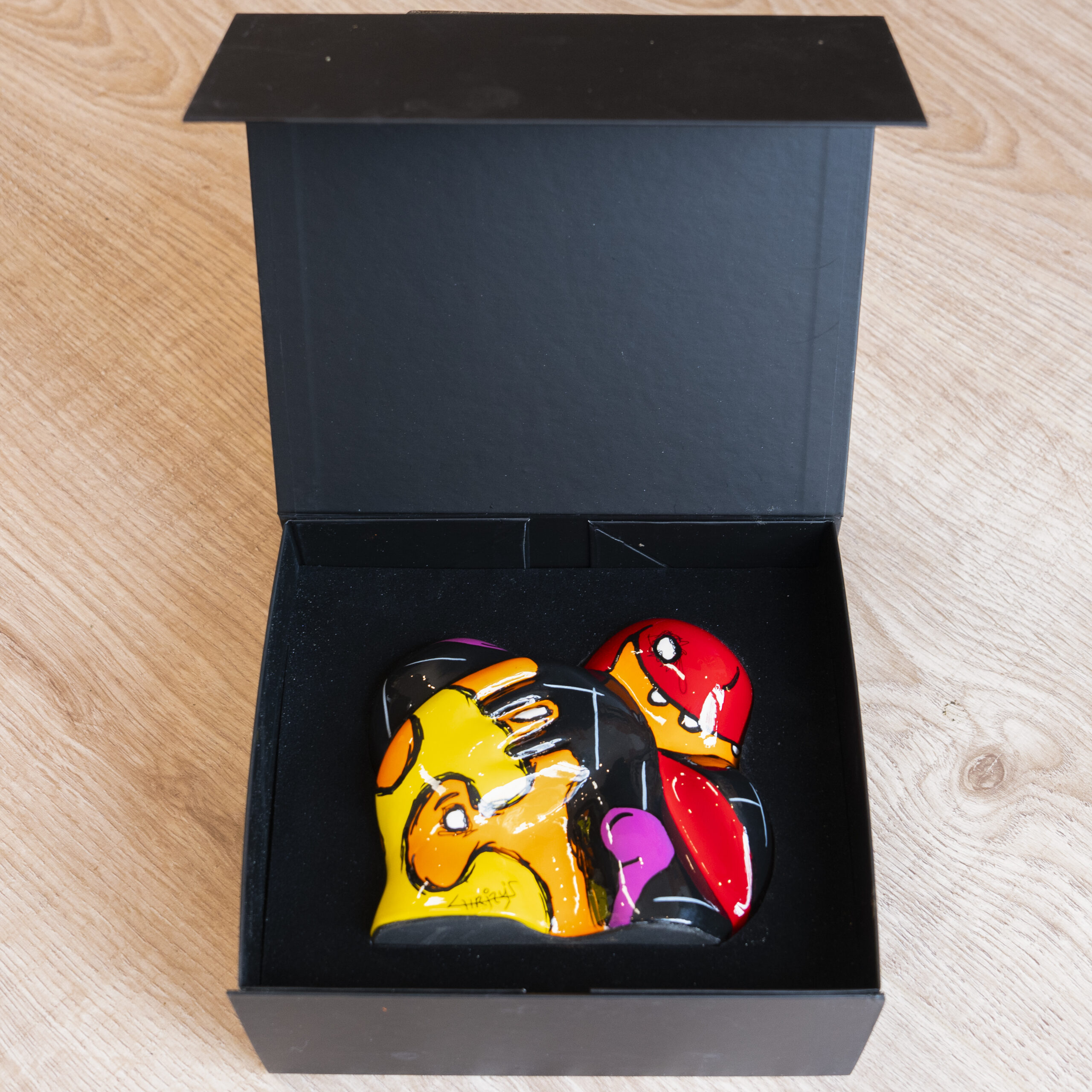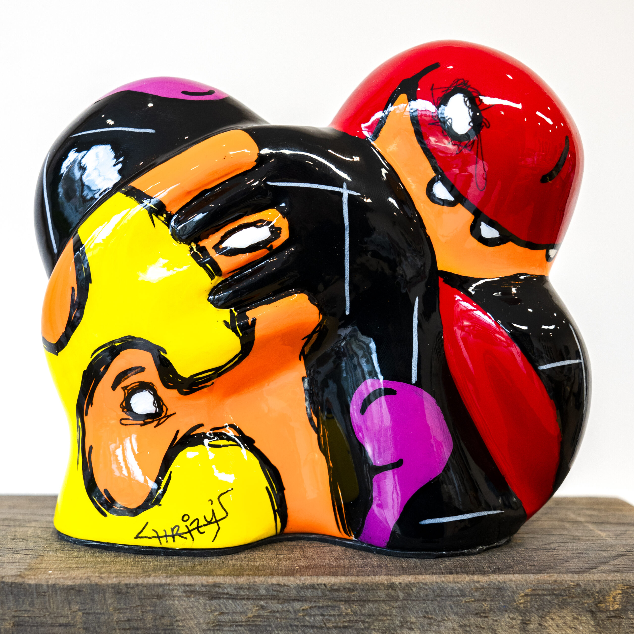 Christian van Hedel’s artworks are all inspired by everyday life and love. He has miraculously managed to convert his 2D work into 3D sculptures. These very special sculptures have thus been given an extra dimension and come even more to life. Each sculpture is hand crafted and hand painted. Each sculpture is therefore very unique. These sculptures are from the Friendship series. You also see people facing each other, and the usual hands that are folded together. They depict friendship and love. Commitment and cheerfulness. The material of the sculpture is marble resin. Marble resin is used because it is a product with a high quality value. It’s hard and heavy. The urban figures are painted by hand with the very recognizable shapes that Christian usually uses in his works. These are painted by hand with acrylic paint and a two-component clear car lacquer is used as a top layer. This creates a very bright glossy surface that also protects the sculpture against UV light and scratches. In short, this is a very beautiful, modern work of art with a touch of urban. If you look at it longer to his works, you will recognize more and more. If you would like to know more about a particular artwork, do not hesitate to contact the artist Christian.