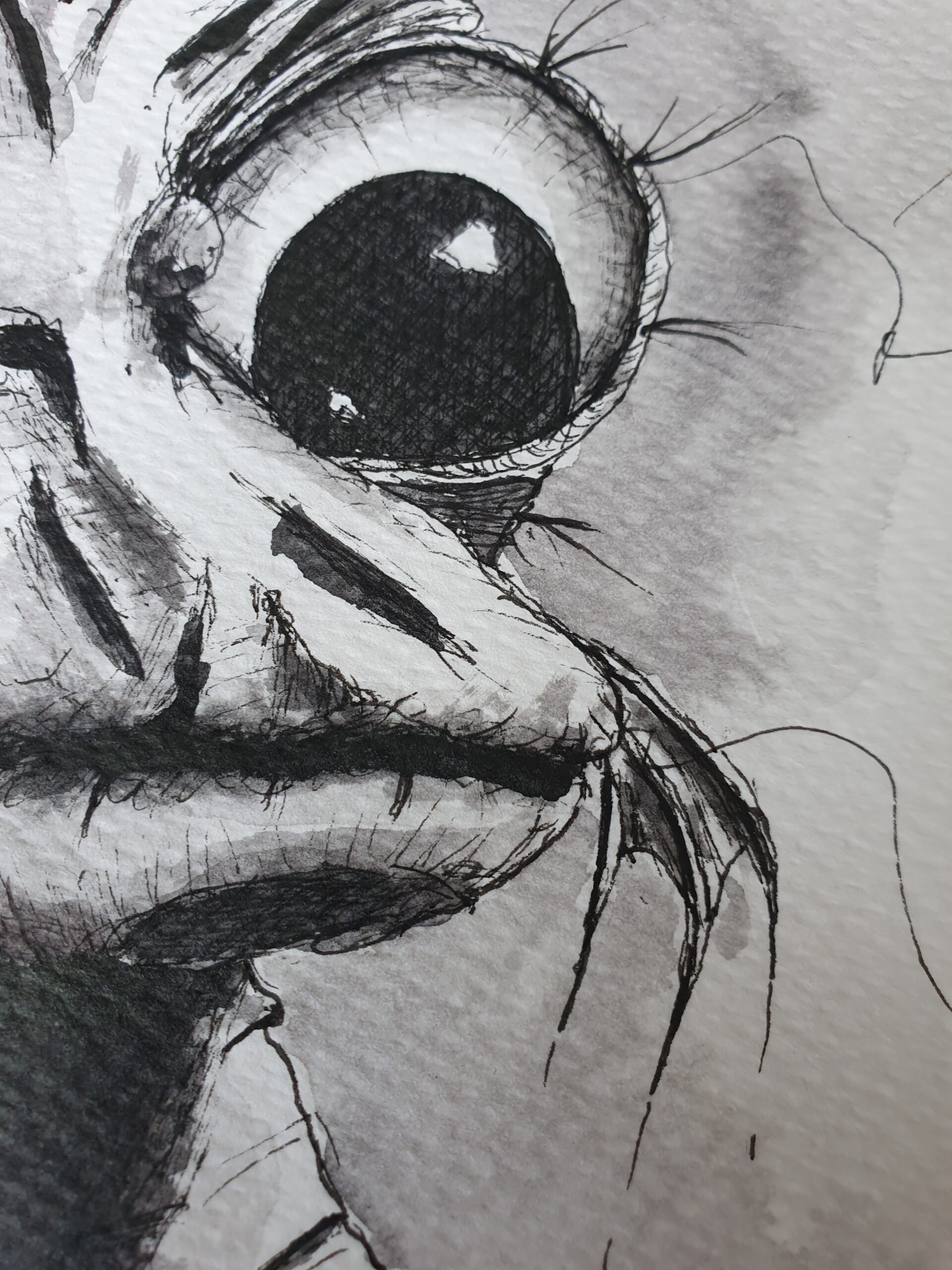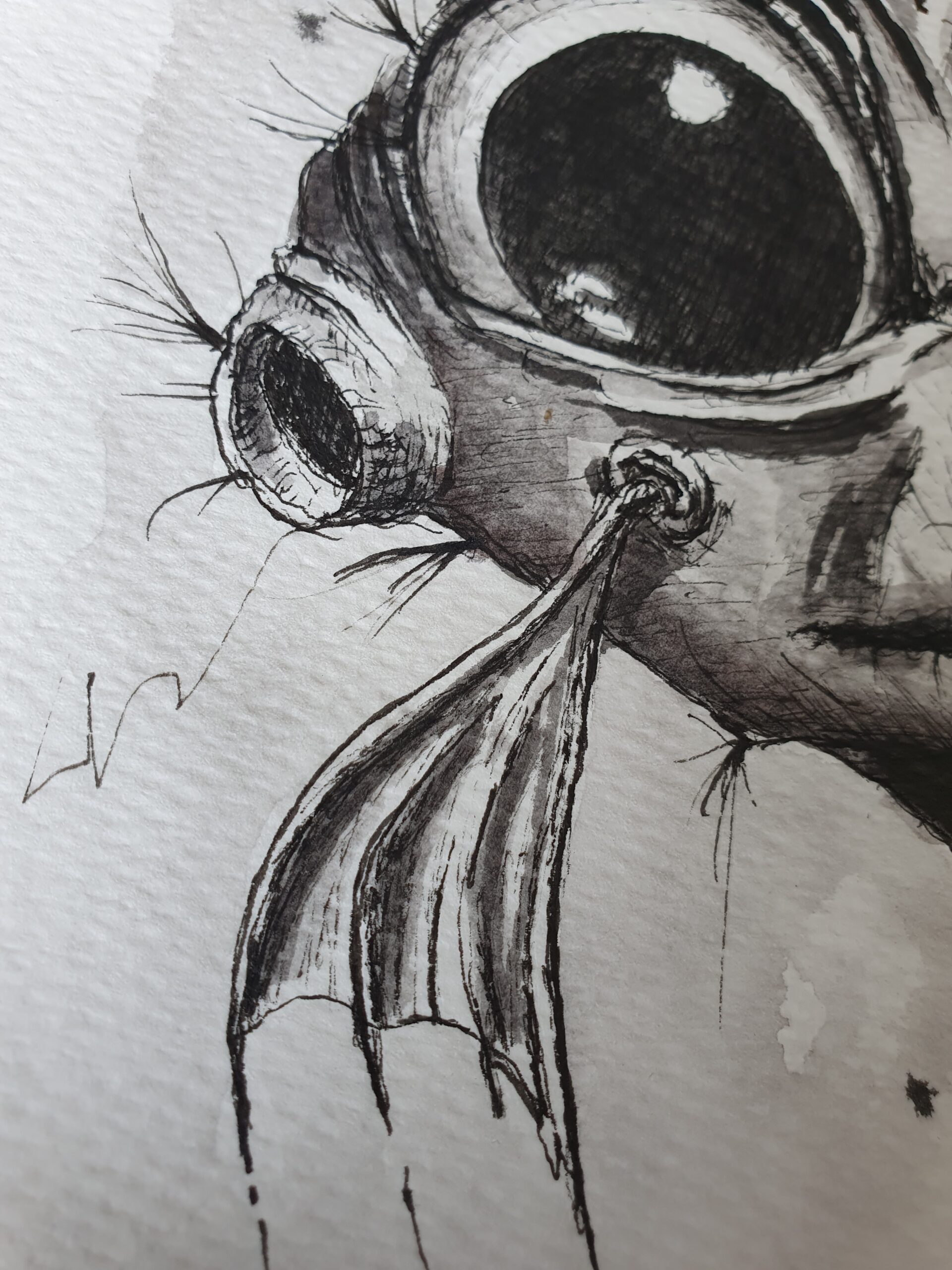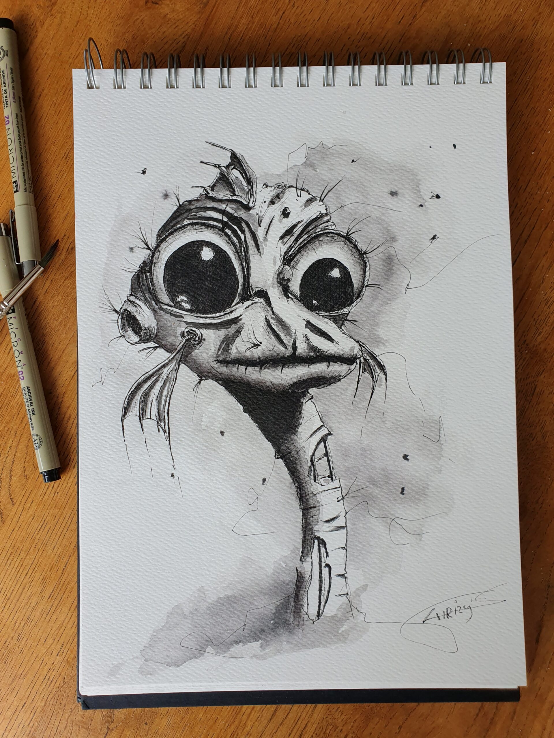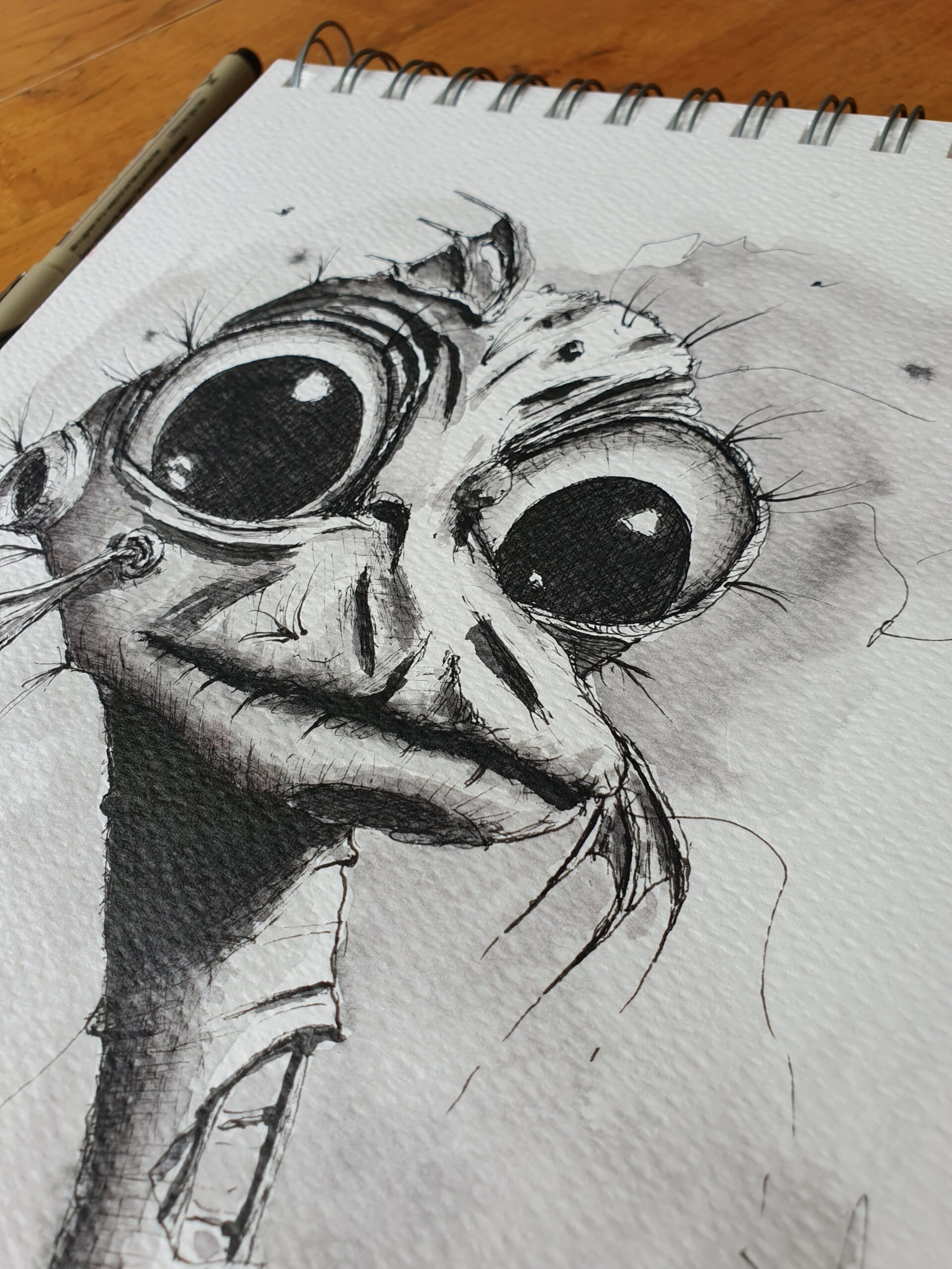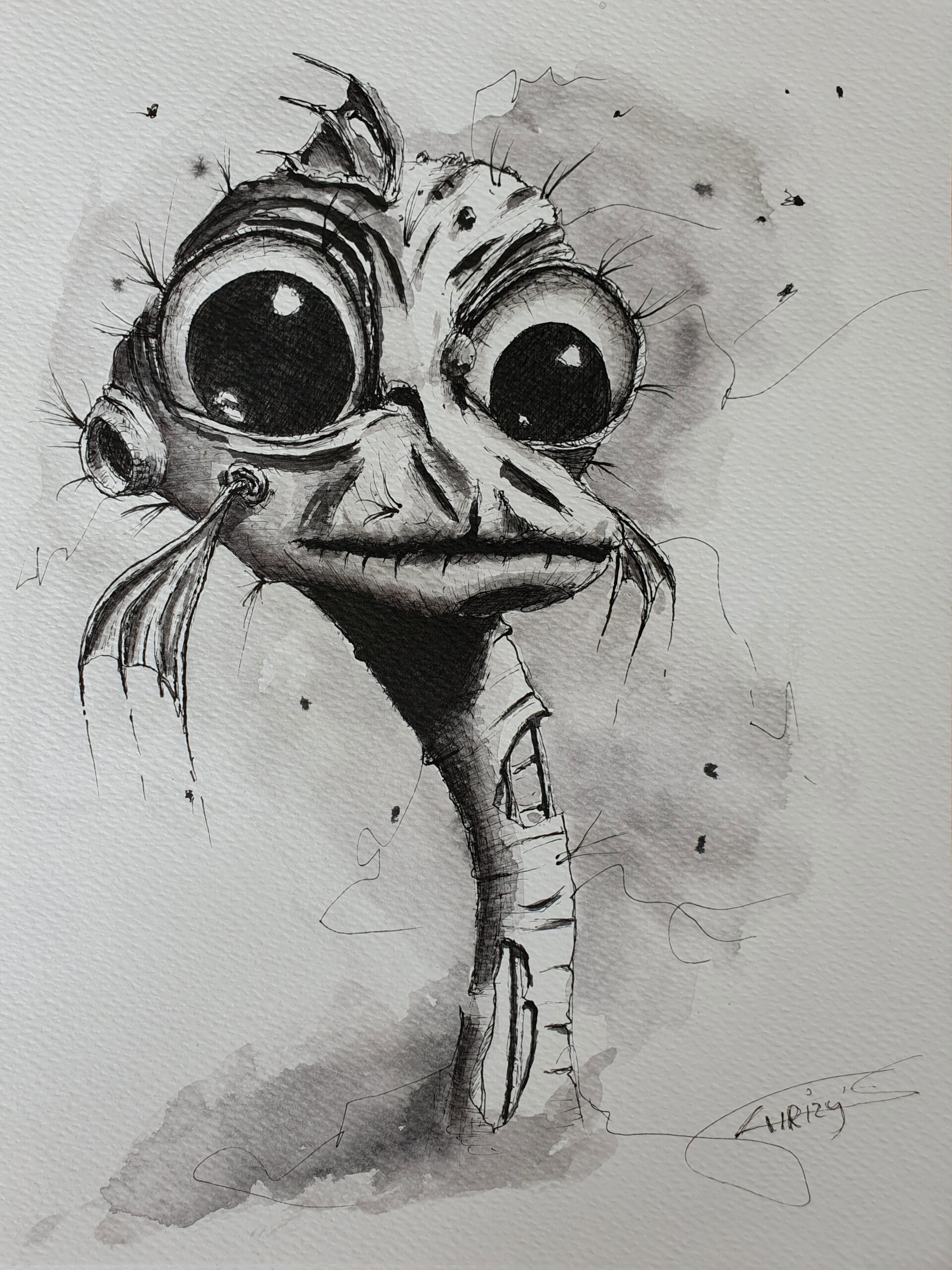 Grozak is a mysterious creature with a unique appearance. His large, glistening eyes exude curiosity and a hint of mischief. His rough skin and unusual shapes tell the story of an adventurous life in a world full of secrets. The fine details and use of shadows in the sketch give Grozak a vivid and dynamic presence, making him seem alive on the paper.