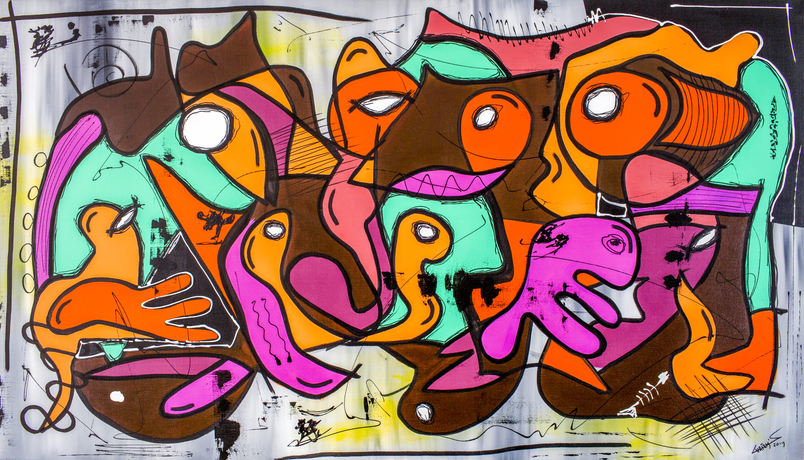 Christian van Hedel’s artworks are all inspired by everyday life and love. His artworks are modern and abstract, with a touch of urban. Sometimes Christian gives a funny twist to his story by adding a cartoon character. This will clarify and strengthen the story in a humorous way. All other abstract works do not have this, but the shapes he uses can still be recognized as persons, animals or things. If you look at it longer, you will recognize more and more. If you would like to know more about a particular artwork, do not hesitate to contact the artist Christian.