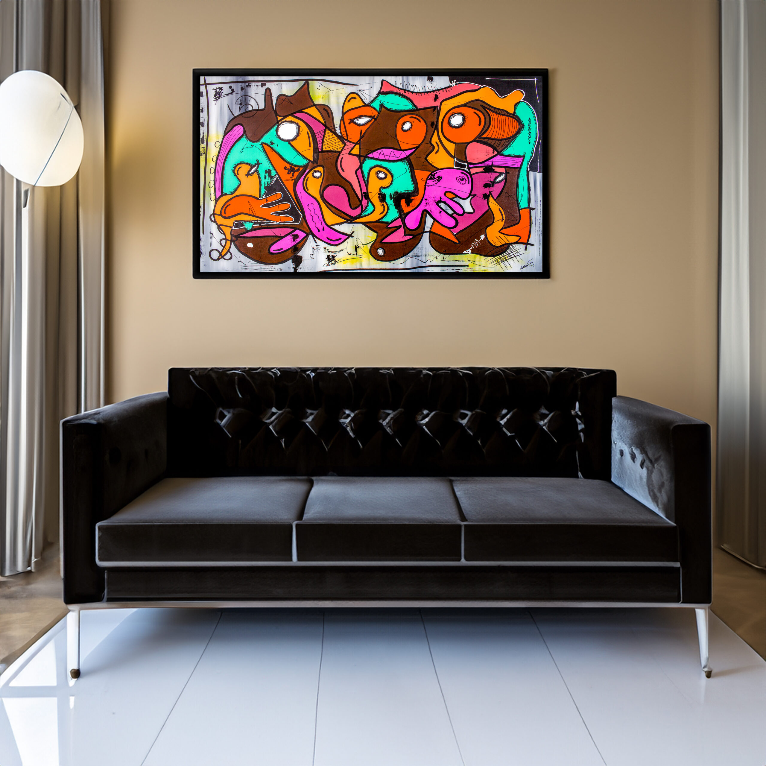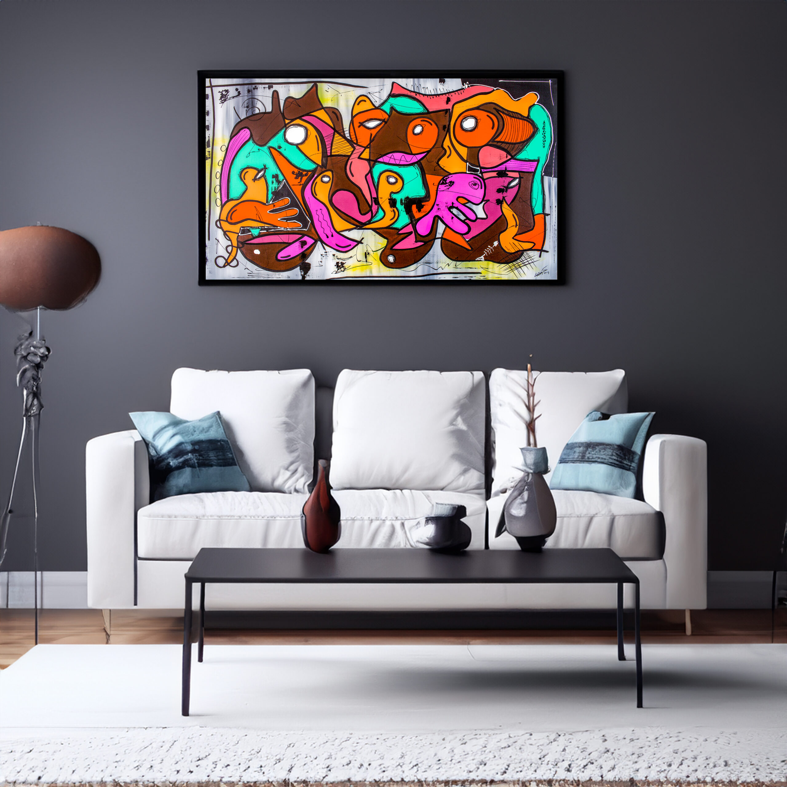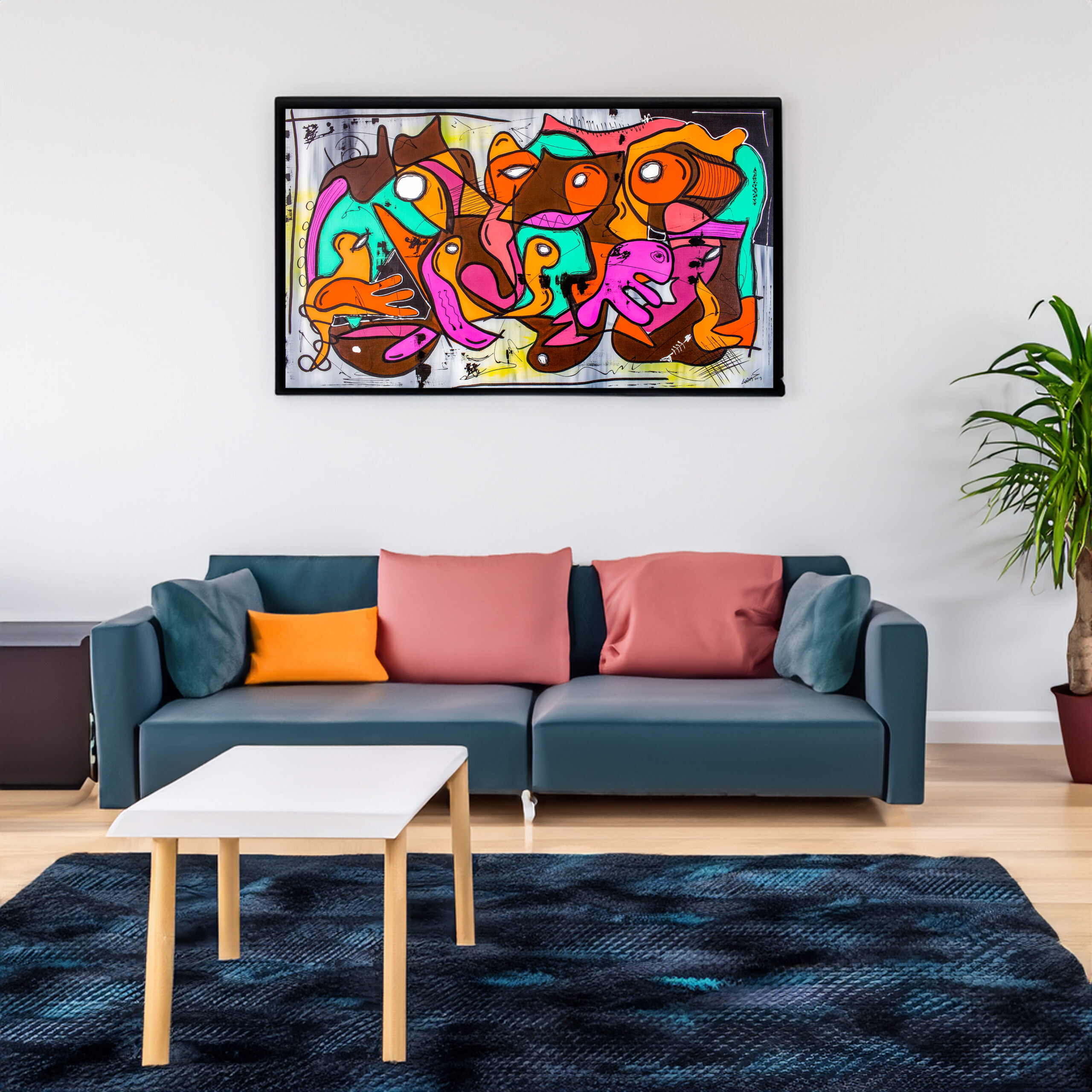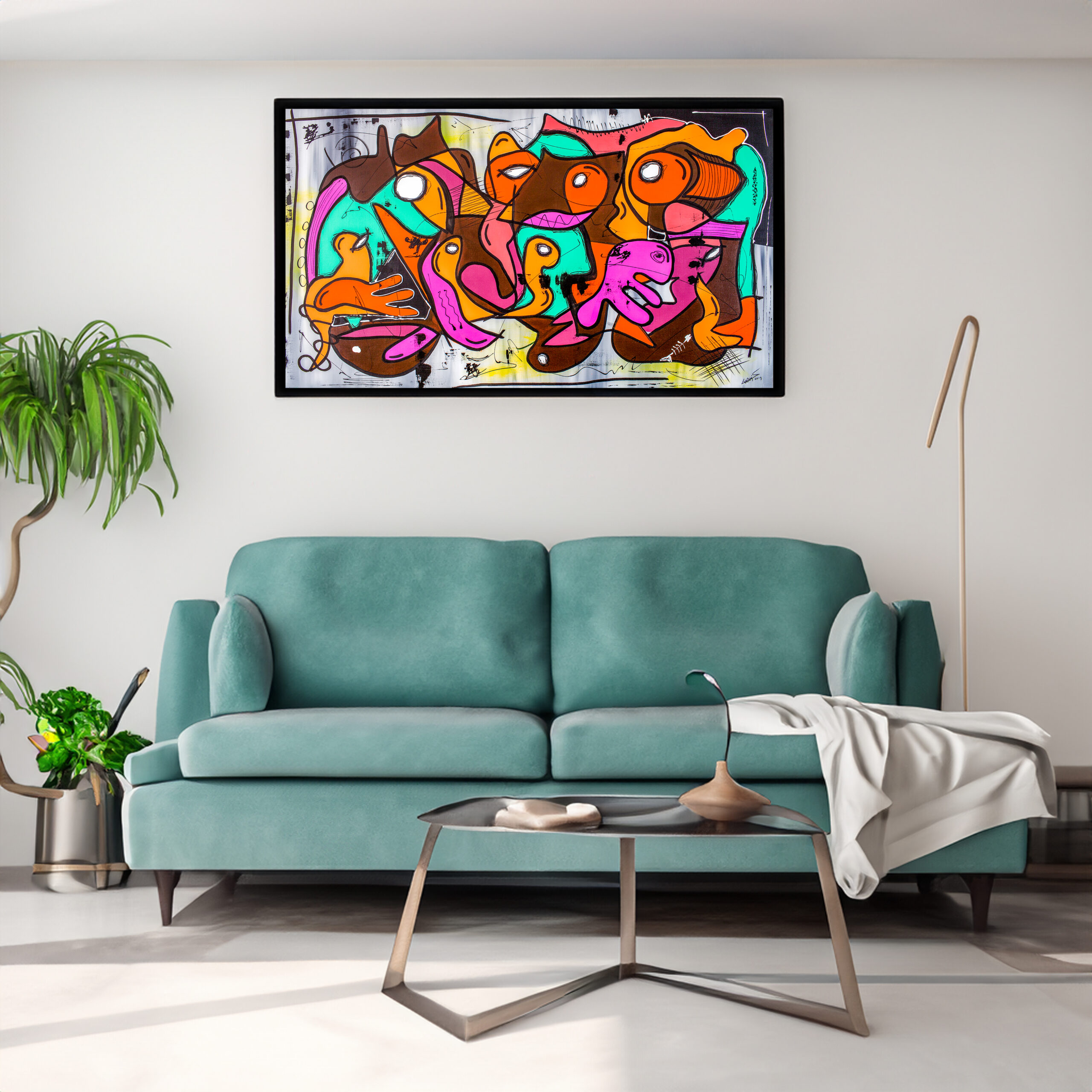 Painting Responsibility is a modern abstract painting with a touch of urban. It represents our responsibility to our children. If you look closely you can see several characters in the background, all holding a smaller character. They proudly hold their children. Protective and mothering. We realize that we must take responsibility because our children are the future of this world. We must be careful with it. A beautiful colorful abstract painting that has been completely balanced. If you look longer you will discover many more elements, such as dancing people. Each shape or element has an addition to the story. Can you finish the story?