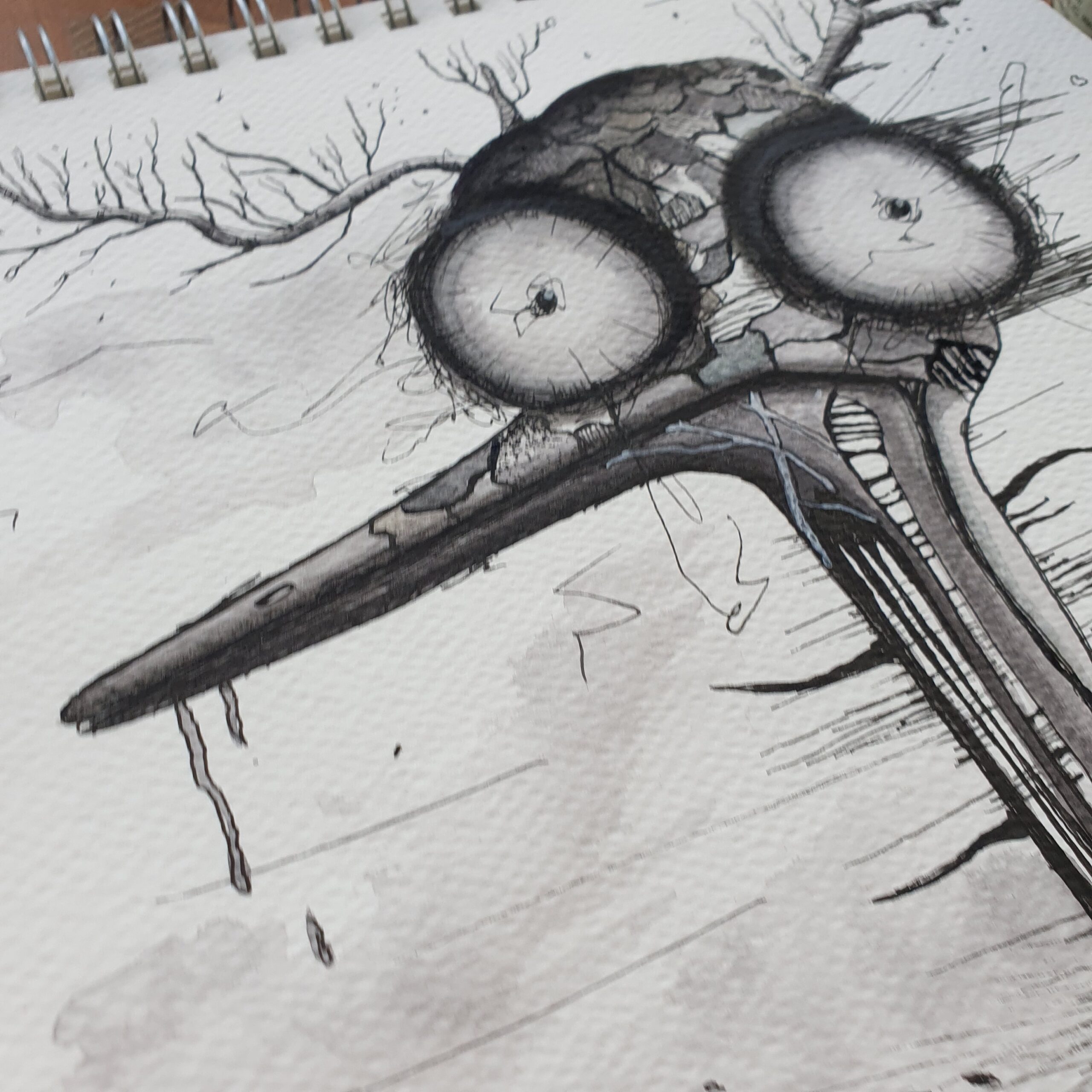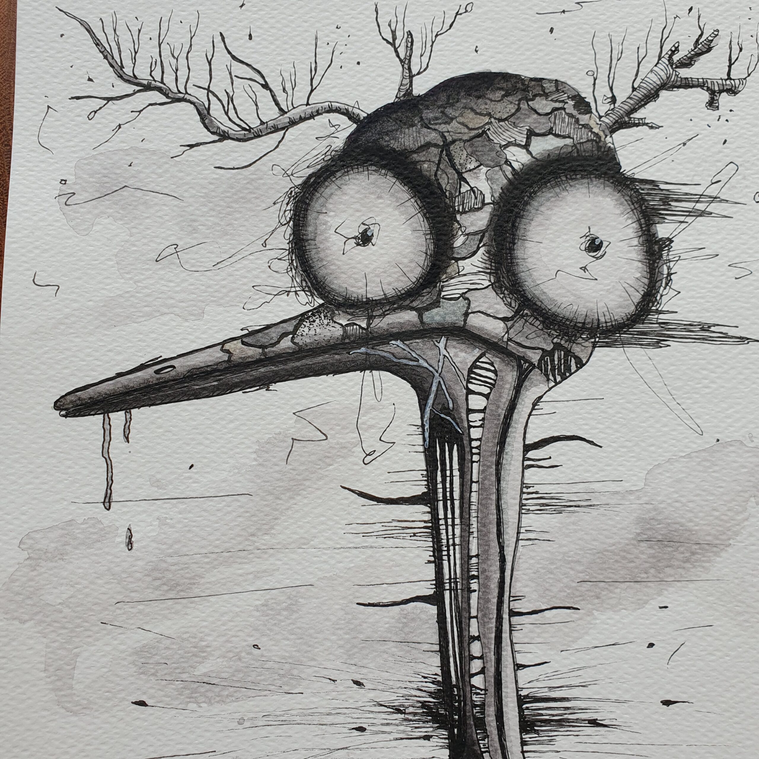 At the center stands a bird-like creature with an elongated beak and two large, circular eyes that dominate its face. The eyes, outlined in stark black and white, give the creature an intense, almost startled expression. The head of the creature appears to be made of cracked and textured surfaces, resembling a mosaic of scales and organic matter, blending seamlessly into the barren, branch-like structures that extend from its head like antlers.