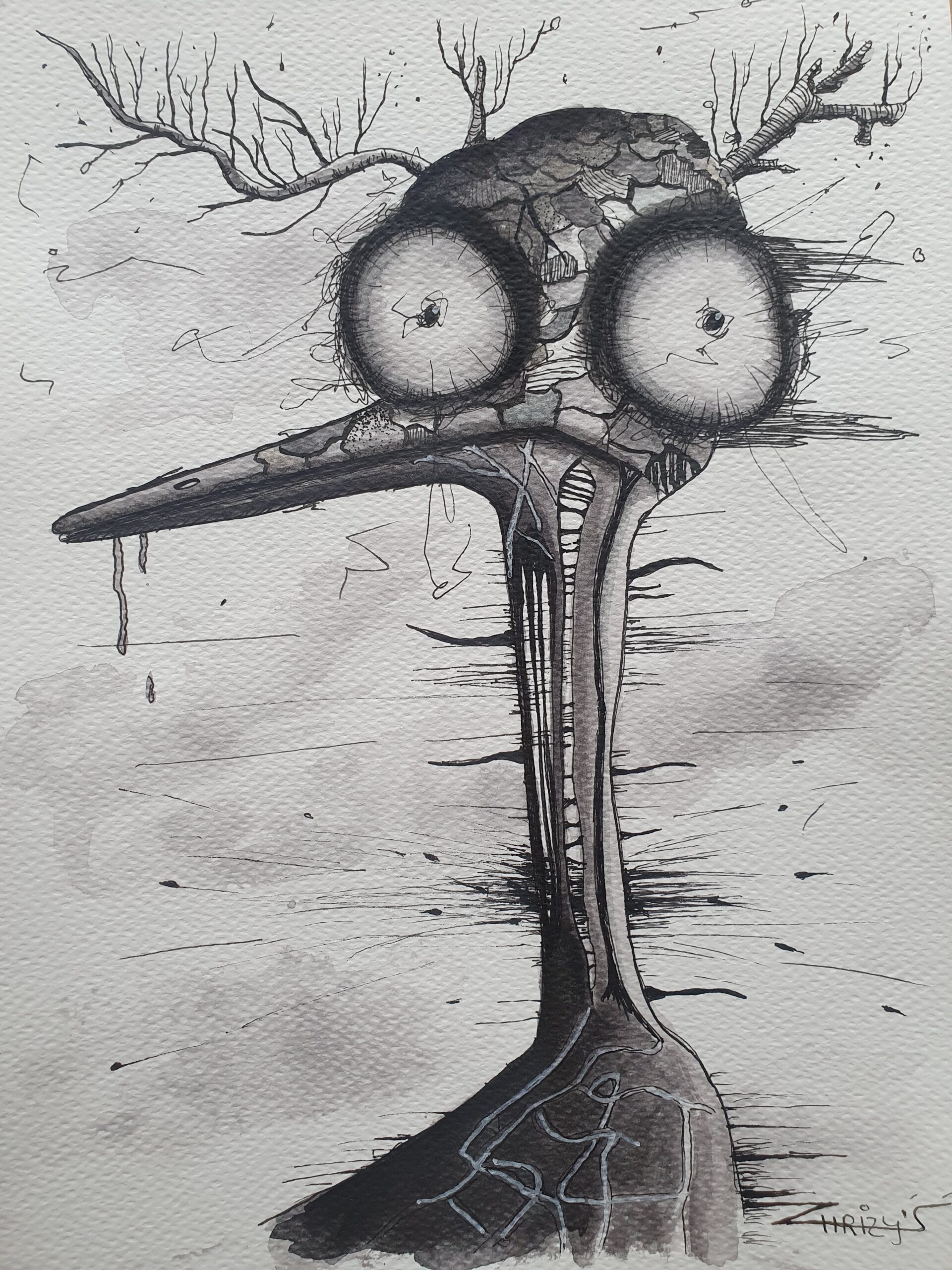 This drawing, titled “TickTock,” is a surrealistic drawing of a bird-like creature that immediately draws attention. The background of the artwork is a subtle blend of grayscale tones, with delicate washes of light gray and fine ink lines that add depth and texture.
