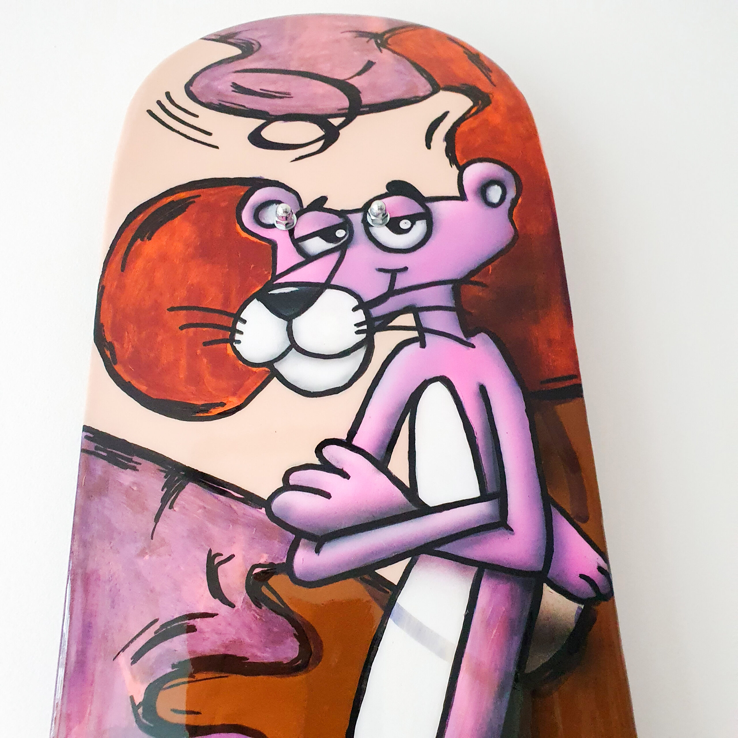 Pink panther stands there nonchalantly. Looks like he pulled a few too many pranks and has to pay a price for it. Caught in his own joke, yet with enough freedom of movement to continue. This work is also related to our lives. Live it, but take others and everything around us into account. Then everything is beautiful for everyone.